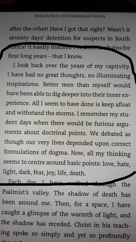 Meanwhile I’ve finished the Terry Waite book which has appropriately given me food for thought all the way through. In particular this paragraph:
