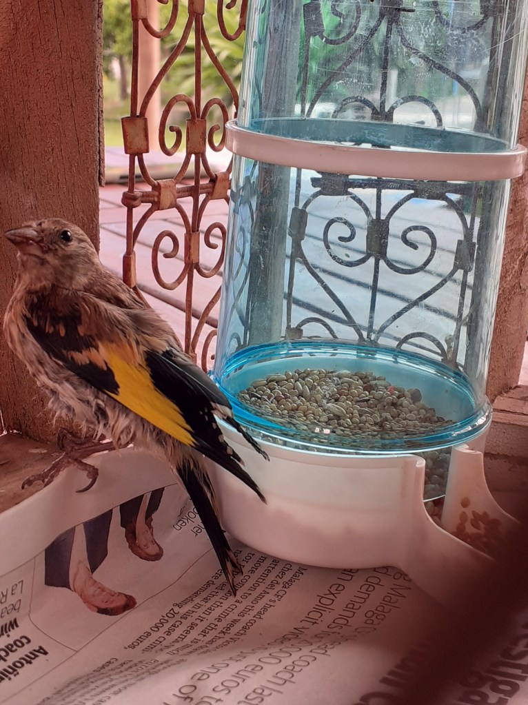 Kids went off for a bike ride this afternoon and came back with an injured baby bird. Looks like some sort of Finch? Broken or damaged wing it appears. We cleared out my old ornamental bird cage for the time being to give it time to heal. Hoping bird seed we give to the sparrows will suffice? Son found a vacated bird’s nest in one of our orange trees so we’ve put that in there too. Cute little thing. Hope it survives and mends.